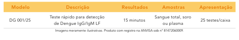 A Dengue é uma arbovirose transmitida pelos mosquitos Aedes aegypti e Aedes albopictus. É uma doença tipicamente de regiões tropicais e subtropicais do planeta, causando aproximadamente 100 milhões de infecções anuais. Indicado para fase aguda (IgM) e de convalescência (IgG) da doença.