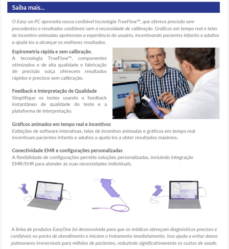Para aqueles que procuram um espirômetro totalmente integrado a PC, o Easy on-PC é uma solução clinicamente comprovada. O Easy-on PC aproveita nossa confiável tecnologia TrueFlow™, que oferece precisão sem precedentes e resultados confiáveis sem a necessidade de calibração. Gráficos em tempo real e telas de incentivo animadas aprimoram a experiência do usuário, incentivando pacientes infantis e adultos a ajudá-los a alcançar os melhores resultados.