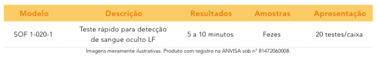 Teste imunocromatográfico para detecção qualitativa de sangue oculto fecal. Quando em fase inicial, doenças como Câncer de Cólon, Úlceras, Pólipos, Colite, Diverticulite e Fissuras, apesar de não apresentarem sintomas clínicos, podem levar à presença de sangue oculto nas fezes.