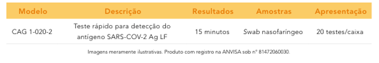 Teste de imunocromatografia para detecção qualitativa de antígeno para COVID-19. Indicado para pacientes com suspeita ou infecção ativa por COVID-19.
