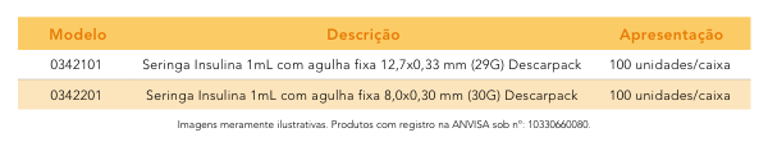 As Seringas para Insulina 1 mL com Agulha Fixa Descarpack foram desenvolvidas para aplicação de insulina pela via subcutânea e/ ou intradérmica em hospitais, clínicas, laboratórios, farmácias e domicílios. Atendendo as necessidades dos profissionais de saúde e portadores de diabetes com qualidade e segurança.