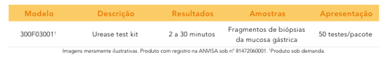 Teste colorimétrico para detecção qualitativa da bactéria Helicobacter pylori. A H. pylori é um dos principais agentes causadores de problemas como gastrite, esofagite, duodenite, úlcera e, até mesmo, câncer no estômago. O teste é realizado durante o exame de endoscopia, onde é feita a biópsia para análise histopatológica. Se a urease produzida pela H. pylori estiver presente no fragmento, ocorrerá hidrólise da ureia tornando amônia, que alcaliniza o meio, promovendo a mudança de cor do amarelo para rosa.