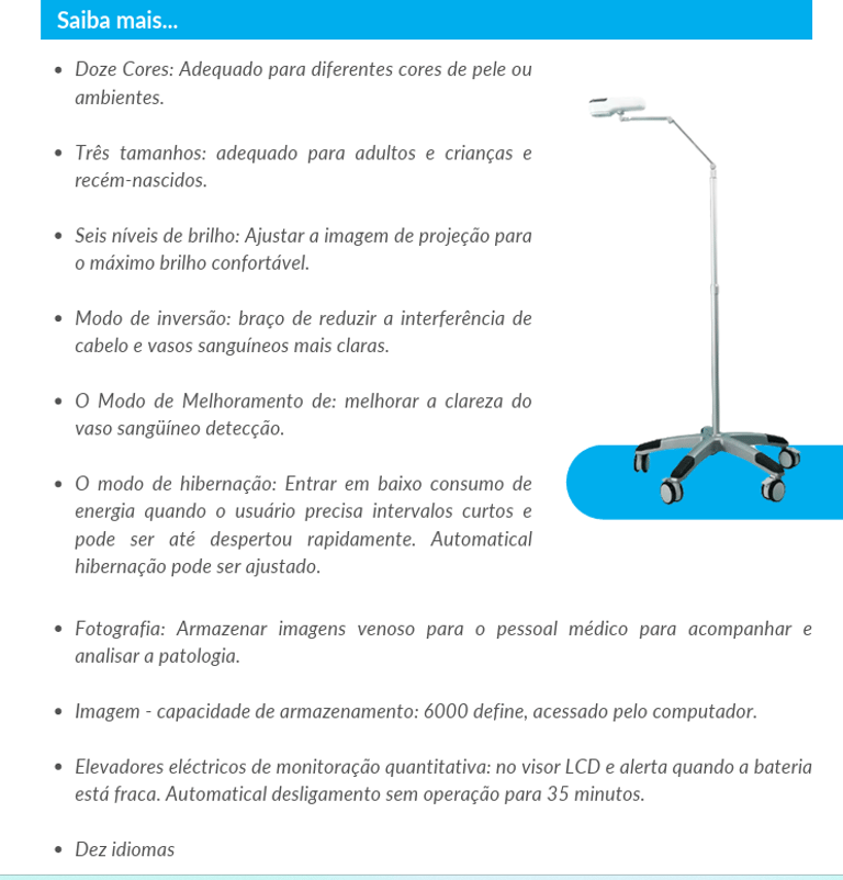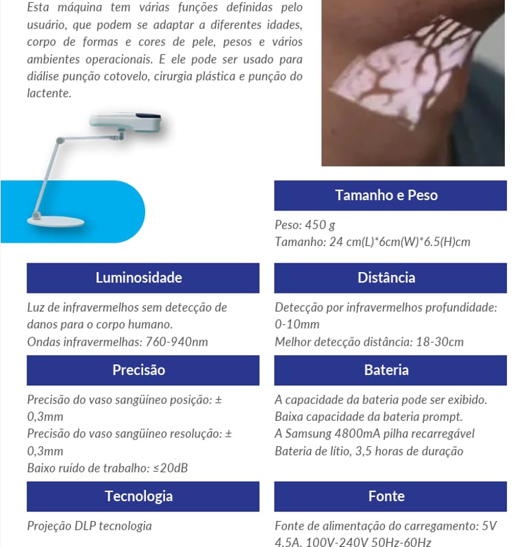 Este equipamento tem várias funções definidas pelo usuário, que podem se adaptar-se a diferentes idades, corpos, formas, cores de pele, pesos e vários ambientes operacionais. E ele pode ser usado para diálise punção cotovelo, cirurgia plástica e punção do lactente.