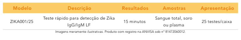 A doença causada pelo vírus Zika, é uma arbovirose transmitida pelos mosquitos Aedes aegypti e Aedes albopictus e característica de regiões tropicais e subtropicais do planeta. A maior preocupação é a infecção de gestantes, visto que vírus pode atravessar a placenta e infectar o feto. Indicado para fase aguda (IgM) e de convalescência (IgG) da doença.